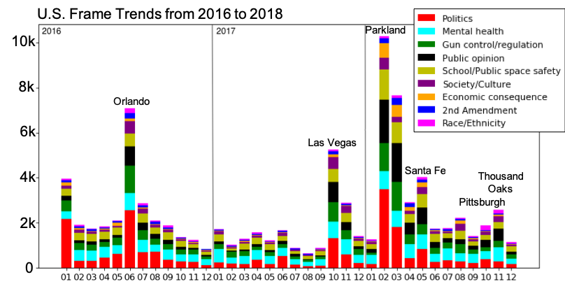 Detecting frames in news headlines and analyzing framing trends surrounding US gun violence.